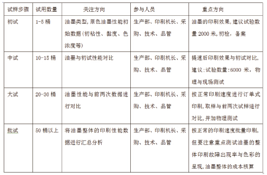 在這個(gè)試樣的環(huán)節(jié)上,我們企業(yè)采購部或技術(shù)部、品管部、生產(chǎn)部,要詳細(xì)做好試樣產(chǎn)品的質(zhì)量、印刷數(shù)據(jù)、產(chǎn)品工藝數(shù)據(jù),可以為后續(xù)的油墨質(zhì)量跟蹤提供數(shù)據(jù),以此檢測供應(yīng)商產(chǎn)品的質(zhì)量穩(wěn)定性。在試樣期間,我們建議油墨供應(yīng)商的技術(shù)服務(wù)人員,全程與企業(yè)生產(chǎn)技術(shù)人員溝通,如果能夠做到產(chǎn)前油墨操作與知識(shí)的培訓(xùn),正確規(guī)范的使用油墨,對(duì)軟包裝企業(yè)整體技能操作有所提升,將是油墨供應(yīng)商和企業(yè)的雙贏。