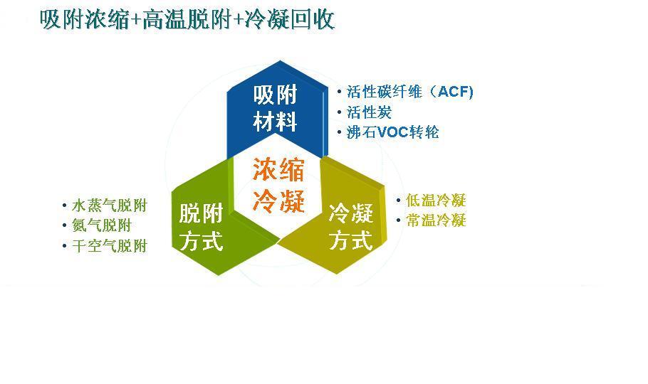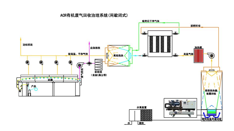 對(duì)于車(chē)間24小時(shí)連續(xù)作業(yè)、廢氣連續(xù)產(chǎn)生的常規(guī)情況,“ACR有機(jī)廢氣回收治理系統(tǒng)”采用多活性炭纖維吸附塔交替運(yùn)作:車(chē)間排放廢氣經(jīng)前級(jí)處理降溫、除塵后,經(jīng)閥門(mén)通過(guò)其中一個(gè)吸附器,廢氣中VOCs被ACF的微孔吸附,經(jīng)吸附處理后的廢氣達(dá)到排放標(biāo)準(zhǔn)后排放。經(jīng)吸附處理后的廢氣達(dá)到排放標(biāo)準(zhǔn)后排放,排放出來(lái)的較低溫、干凈的氣體與客戶(hù)設(shè)備排出的高溫廢氣通過(guò)高效換熱器得到較高溫的氣體重新回到烘箱,熱能得以回收。另一吸附器經(jīng)閥門(mén)連接到脫附回收裝置,脫附回收裝置產(chǎn)生的高溫?zé)峥諝馐笰CF微孔中的VOCs脫附出來(lái),隨空氣循環(huán)送回脫附回收裝置,經(jīng)多級(jí)降溫后進(jìn)入回收系統(tǒng),在低于-30℃以下的低溫下被冷凝成液體得以回收。經(jīng)冷凝回收后的空氣再經(jīng)多級(jí)升溫后循環(huán)進(jìn)入吸附器進(jìn)行脫附。脫附結(jié)束后,脫附回收裝置送出冷空氣對(duì)吸附器進(jìn)行降溫,降溫完成后通過(guò)閥門(mén)切換到吸附狀態(tài),同時(shí)另一吸附器也被切換進(jìn)入脫附狀態(tài),如此循環(huán)往復(fù)連續(xù)工作,實(shí)現(xiàn)有機(jī)溶劑回收及廢氣達(dá)標(biāo)排放。